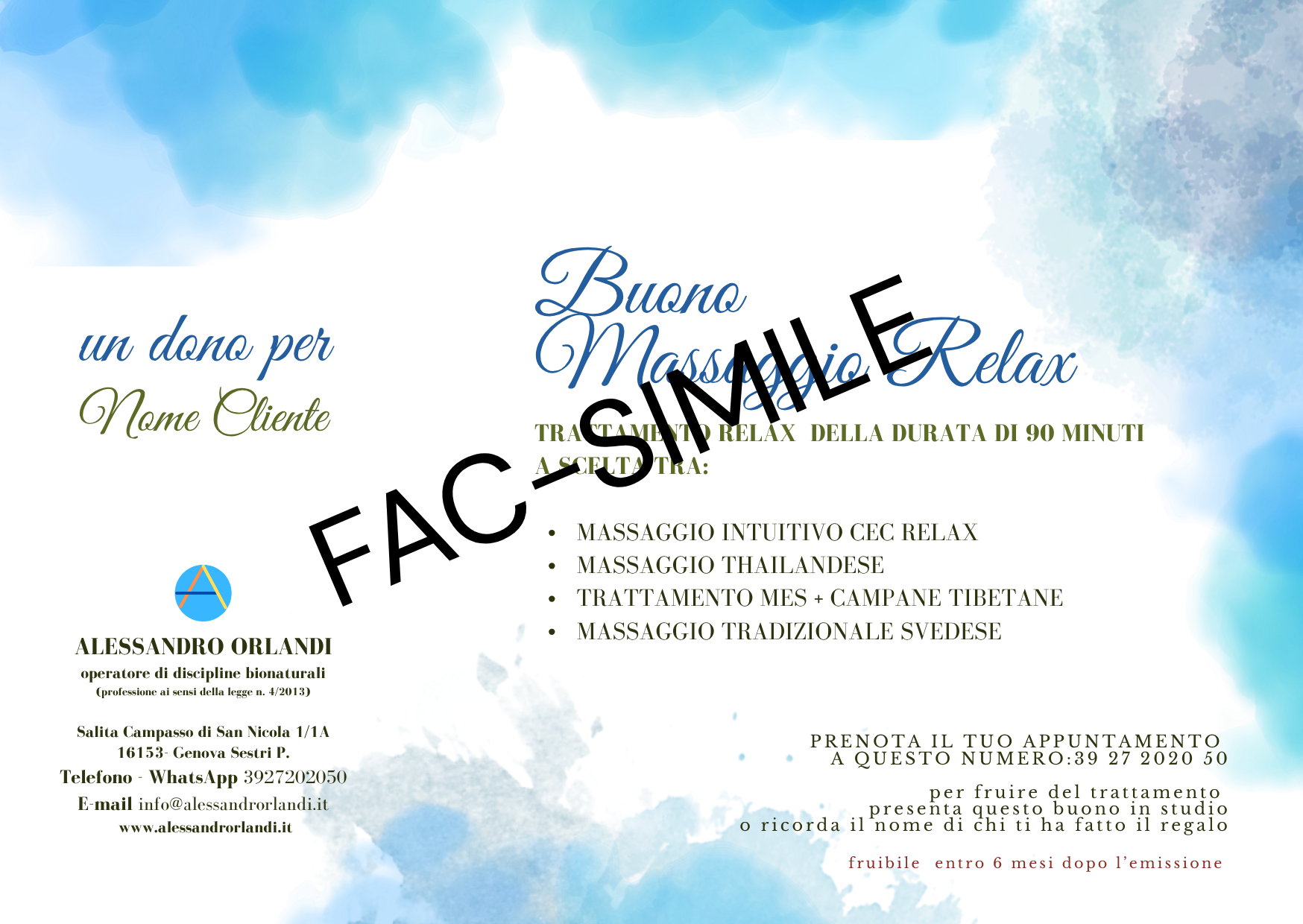 You can go directly to the studio in Genova Sestri Ponente and request the personalized gift voucher or request it via email by filling out the form below and you can pay by bank transfer, credit card and/or debit card or satispay, if you prefer.